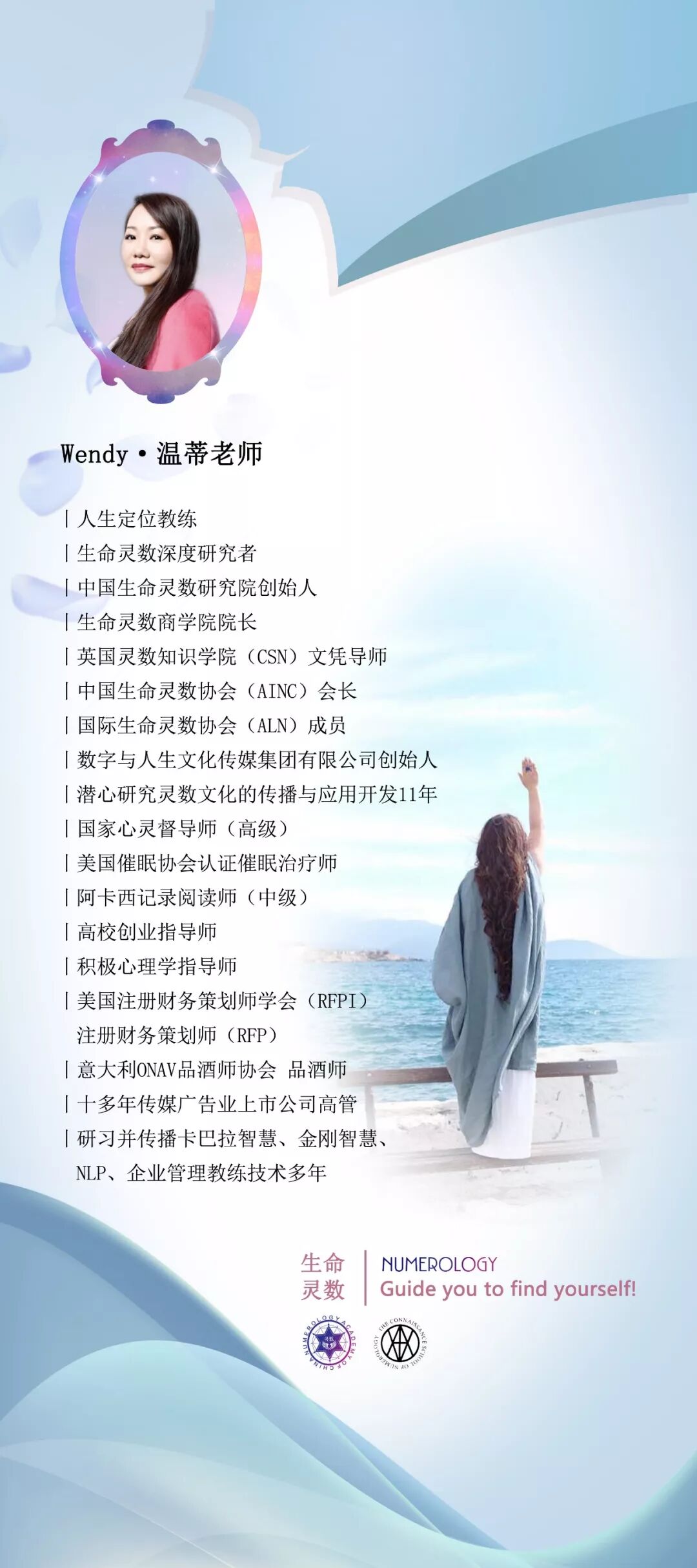 一切真正的成功和自由 都是从接纳自身、拓展自我开始 授课导师 Wendy 中国生命灵数研究院创始人 英国灵数知识学院(CSN)文凭教師 中国生命灵数协会(AINC)会长 国际生命灵数协会(AlN)成员 数字与人生文化传媒集团有限公司创始人 Wendy,生命灵数深度研究者,灵数行者。潜心研究灵数文化的传播与应用开发11年,独创数字积极心理学,帮助个案近60000人,辅导企业数千家。她是将欧美灵数国际资格认证引入中国的第一人;她是让国际灵数协会灵数导师扶植计划在中国落地的引路先驱;她联合最前沿的国际权威灵数专家创办中国生命灵数研究院;她成立了中国生命灵数协会并亲自担任会长,提供所有灵数学者一个专业平台。致力于帮助更多人借助灵数提升自我认知,成就幸福人生。此外Wendy老师曾师从宾夕法尼亚大学“积极心理学”之父马丁·塞利格曼教授,多年研习并传播卡巴拉智慧、金刚智慧、NLP、企业管理教练技术多年。 擅长领域:婚恋情感、家庭关系、合作关系、财富和事业、投融资决策、团队管理,在生命灵数应用于职业规划、组织管理、商业经营等方面积累了深厚的实践经验和独到见解。 独特教法:简单直接、落地实用、快速见效。让任何一个普通人都能学会,学了就都能用上,用上就能解决自己人生中的各类问题! 教学效果:拨云见日、心生喜悦、心生力量、心生智慧、立即行动。 学员分享 Wedny的成人幼儿园 零基础生命灵数工作坊 ☉ 课程报名咨询 课程助理:zhongta66 |